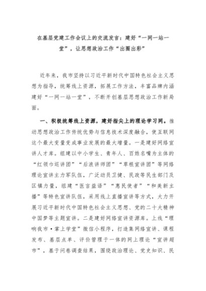 【七哥公文】2024年:在基层党建工作会议上的交流发言:建好“一网一站一堂”,让思想政治工作“出圈出彩”+更多免费公文+VX:QiGeGongWen2024