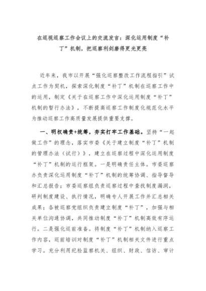 【七哥公文】2024年:在巡视巡察工作会议上的交流发言:深化运用制度“补丁”机制,把巡察利剑磨得更光更亮+更多免费公文+VX:QiGeGongWen2024