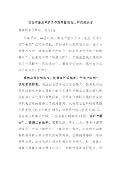 / 【七哥公文】2024年:在全市基层减负工作观摩推进会上的交流发言+更多免费公文+VX:QiGeGongWen2024