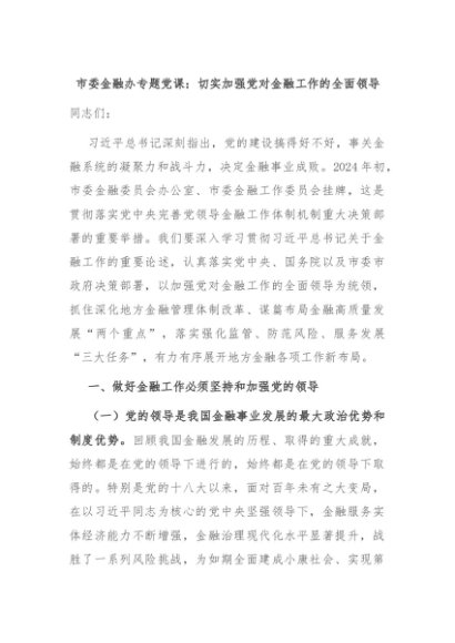 【七哥公文】2024年:市委金融办专题党课:切实加强党对金融工作的全面领导+更多免费公文+VX:QiGeGongWen2024