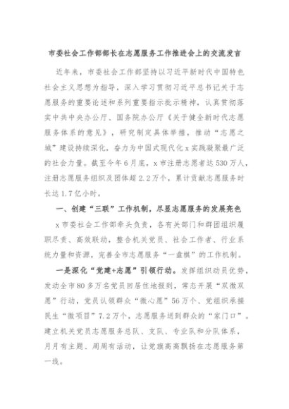 【七哥公文】2024年:市委社会工作部部长在志愿服务工作推进会上的交流发言+更多免费公文+VX:QiGeGongWen2024
