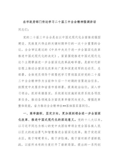 / 【七哥公文】2024年:在市政府部门传达学习二十届三中全会精神强调讲话+更多免费公文+VX:QiGeGongWen2024