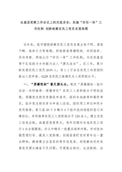 【七哥公文】2024年:在基层党建工作会议上的交流发言:实施“四位一体”工作机制 创新破解农民工党员发展难题+更多免费公文+VX:QiGeGongWen2024