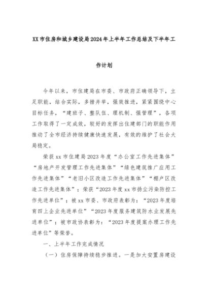 【七哥公文】2024年:XX市住房和城乡建设局2024年上半年工作总结及下半年工作计划+更多免费公文+VX:QiGeGongWen2024