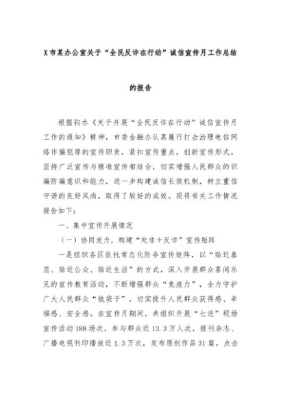 【七哥公文】2024年:X市某办公室关于“全民反诈在行动”诚信宣传月工作总结的报告+更多免费公文+VX:QiGeGongWen2024