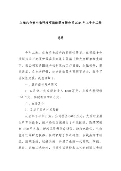 【七哥公文】2024年:上海六合堂生物科技项城制药有限公司2024年上半年工作总结+更多免费公文+VX:QiGeGongWen2024