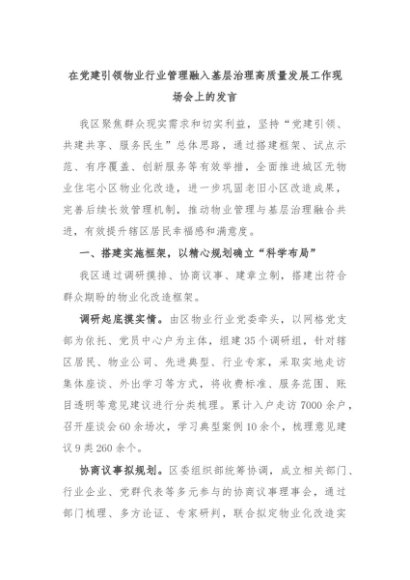 【七哥公文】2024年:在党建引领物业行业管理融入基层治理高质量发展工作现场会上的发言+更多免费公文+VX:QiGeGongWen2024