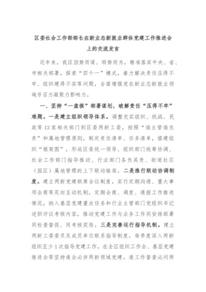 【七哥公文】2024年:区委社会工作部部长在新业态新就业群体党建工作推进会上的交流发言+更多免费公文+VX:QiGeGongWen2024