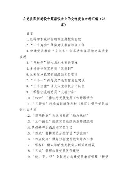 / 【七哥公文】2024年:在党员队伍建设专题座谈会上的交流发言材料汇编+更多免费公文+VX:QiGeGongWen2024
