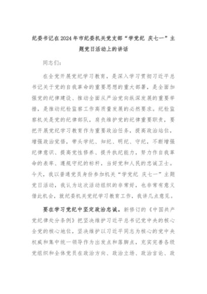 【七哥公文】2024年:纪委书记在2024年市纪委机关党支部“学党纪 庆七一”主题党日活动上的讲话+更多免费公文+VX:QiGeGongWen2024