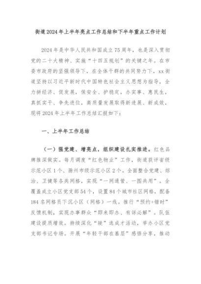 【七哥公文】2024年:街道2024年上半年亮点工作总结和下半年重点工作计划+更多免费公文+VX:QiGeGongWen2024