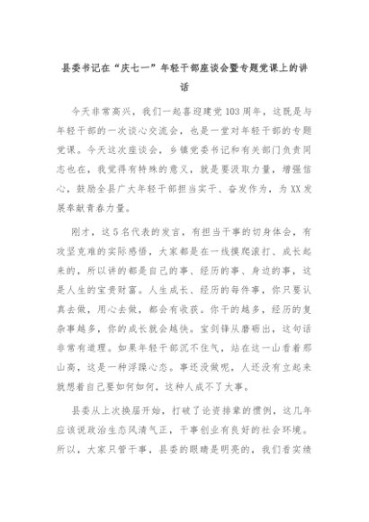 【七哥公文】2024年:县委书记在“庆七一”年轻干部座谈会暨专题党课上的讲话+更多免费公文+VX:QiGeGongWen2024