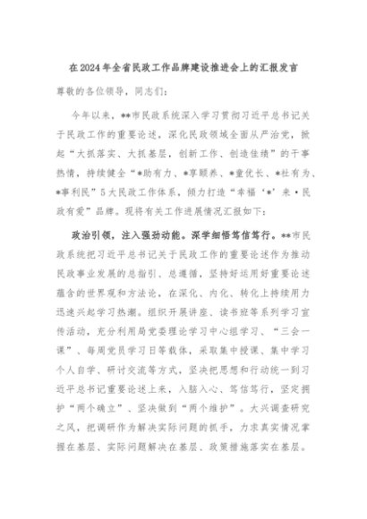 【七哥公文】2024年:在2024年全省民政工作品牌建设推进会上的汇报发言+更多免费公文+VX:QiGeGongWen2024
