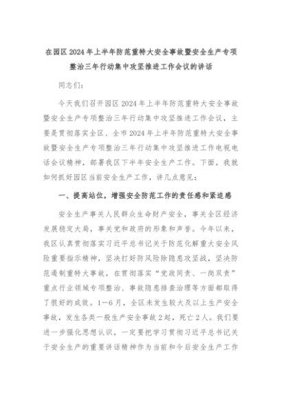 【七哥公文】2024年:在园区2024年上半年防范重特大安全事故暨安全生产专项整治三年行动集中攻坚推进工作会议的讲话+更多免费公文+VX:QiGeGongWen2024