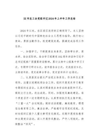 / 【七哥公文】2024年:XX市总工会党组书记2024年上半年工作总结+更多免费公文+VX:QiGeGongWen2024