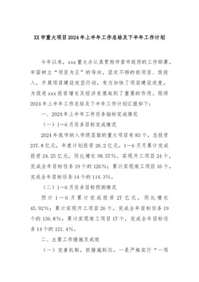 【七哥公文】2024年:XX市重大项目2024年上半年工作总结及下半年工作计划+更多免费公文+VX:QiGeGongWen2024