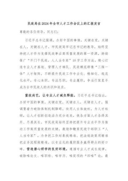 / 【七哥公文】2024年:民政局在2024年全市人才工作会议上的汇报发言+更多免费公文+VX:QiGeGongWen2024