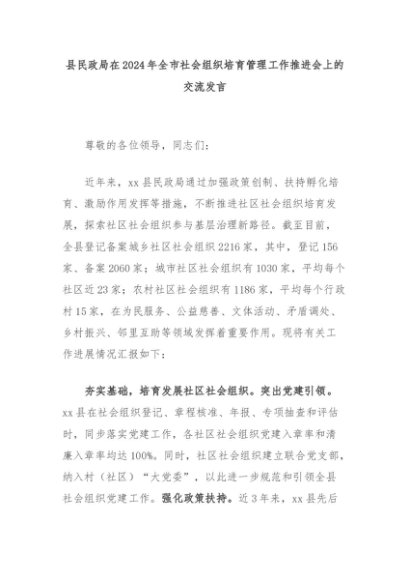 【七哥公文】2024年:县民政局在2024年全市社会组织培育管理工作推进会上的交流发言+更多免费公文+VX:QiGeGongWen2024