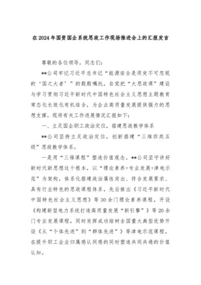 【七哥公文】2024年:在2024年国资国企系统思政工作现场推进会上的汇报发言+更多免费公文+VX:QiGeGongWen2024