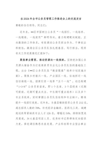 / 【七哥公文】2024年:在2024年全市公务员管理工作推进会上的交流发言+更多免费公文+VX:QiGeGongWen2024