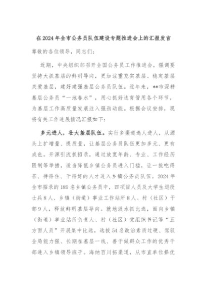 【七哥公文】2024年:在2024年全市公务员队伍建设专题推进会上的汇报发言+更多免费公文+VX:QiGeGongWen2024