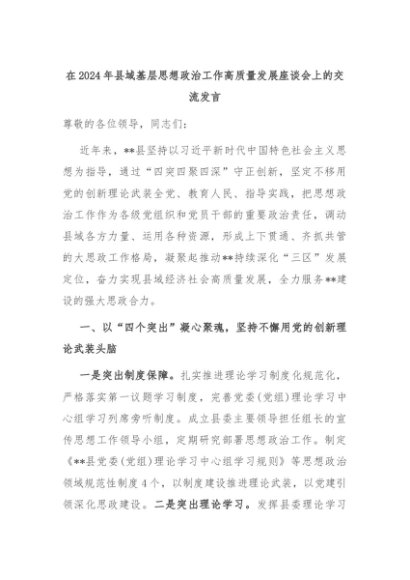 【七哥公文】2024年:在2024年县域基层思想政治工作高质量发展座谈会上的交流发言+更多免费公文+VX:QiGeGongWen2024