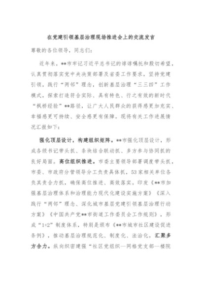 / 【七哥公文】2024年:在党建引领基层治理现场推进会上的交流发言+更多免费公文+VX:QiGeGongWen2024