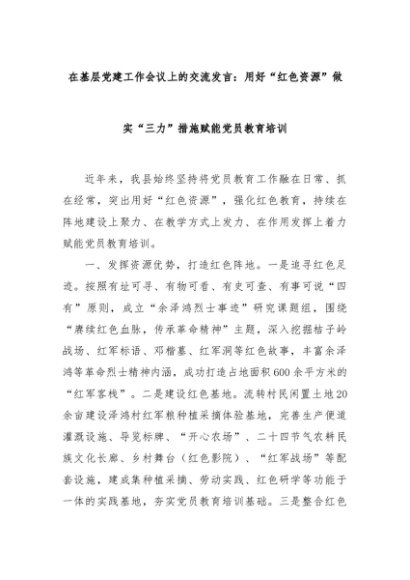 【七哥公文】2024年:在基层党建工作会议上的交流发言:用好“红色资源”做实“三力”措施赋能党员教育培训+更多免费公文+VX:QiGeGongWen2024