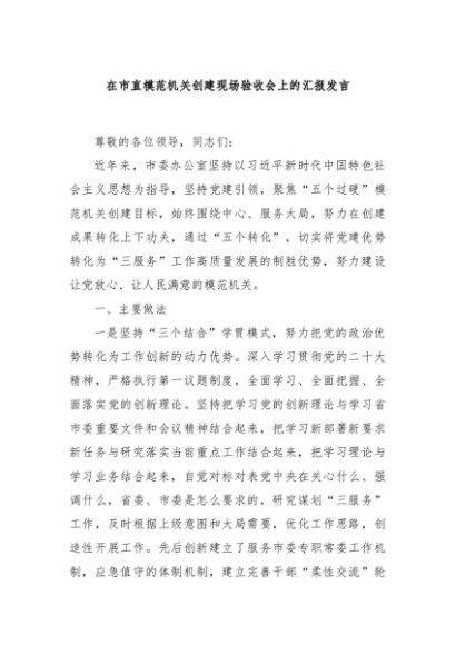 / 【七哥公文】2024年:在市直模范机关创建现场验收会上的汇报发言+更多免费公文+VX:QiGeGongWen2024