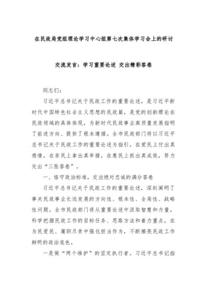 【七哥公文】2024年:在民政局党组理论学习中心组第七次集体学习会上的研讨交流发言:学习重要论述 交出精彩答卷+更多免费公文+VX:QiGeGongWen2024