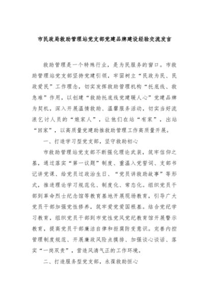 / 【七哥公文】2024年:市民政局救助管理站党支部党建品牌建设经验交流发言+更多免费公文+VX:QiGeGongWen2024