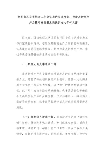 【七哥公文】2024年:组织部在全市经济工作会议上的交流发言:为发展新质生产力推动高质量发展提供有力干部支撑+更多免费公文+VX:QiGeGongWen2024