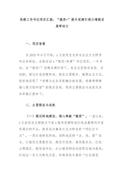 【七哥公文】2024年:党建工作书记项目汇报:“微笑+”提升党建引领力增强发展带动力+更多免费公文+VX:QiGeGongWen2024