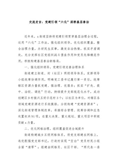/ 【七哥公文】2024年:交流发言:党建引领“六化”深耕基层善治+更多免费公文+VX:QiGeGongWen2024