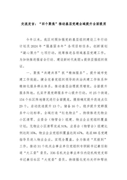 【七哥公文】2024年:交流发言:“四个聚焦”推动基层党建全域提升全面提质+更多免费公文+VX:QiGeGongWen2024