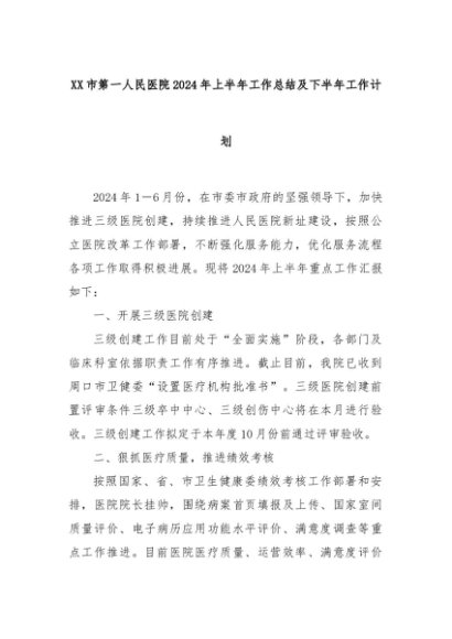 【七哥公文】2024年:XX市第一人民医院2024年上半年工作总结及下半年工作计划+更多免费公文+VX:QiGeGongWen2024