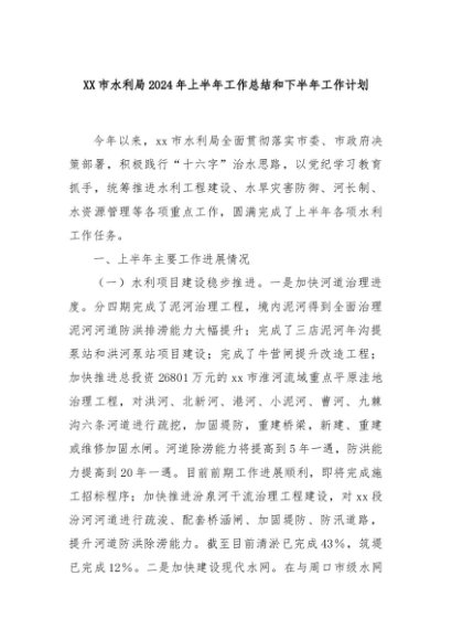 【七哥公文】2024年:XX市水利局2024年上半年工作总结和下半年工作计划+更多免费公文+VX:QiGeGongWen2024