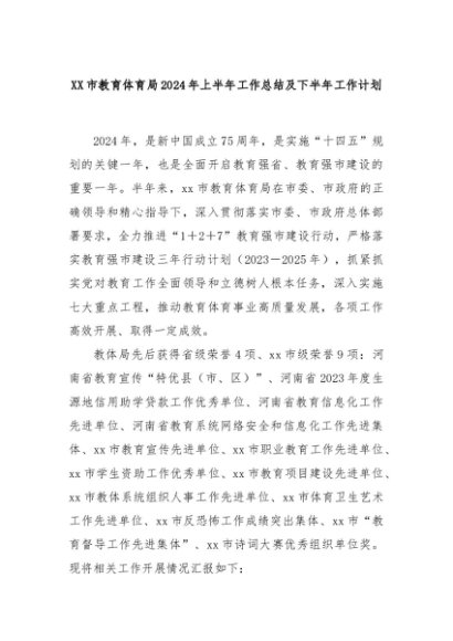 【七哥公文】2024年:XX市教育体育局2024年上半年工作总结及下半年工作计划+更多免费公文+VX:QiGeGongWen2024