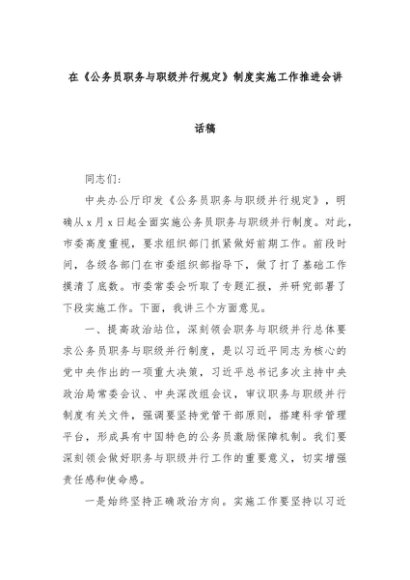 【七哥公文】2024年:在《公务员职务与职级并行规定》制度实施工作推进会讲话稿+更多免费公文+VX:QiGeGongWen2024