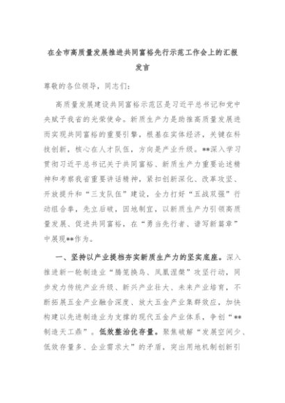 【七哥公文】2024年:在全市高质量发展推进共同富裕先行示范工作会上的汇报发言+更多免费公文+VX:QiGeGongWen2024