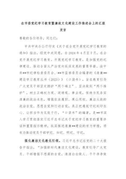 【七哥公文】2024年:在市委党纪学习教育暨廉政文化建设工作推进会上的汇报发言+更多免费公文+VX:QiGeGongWen2024