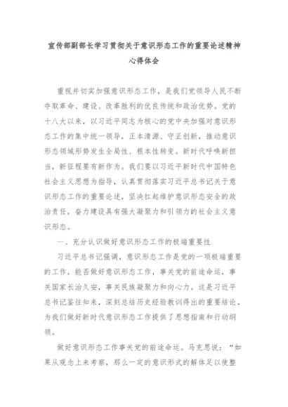 【七哥公文】2024年:宣传部副部长学习贯彻关于意识形态工作的重要论述精神心得体会+更多免费公文+VX:QiGeGongWen2024
