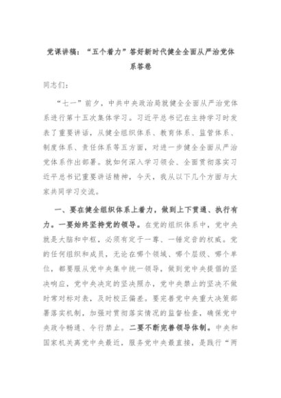 【七哥公文】2024年:党课讲稿:“五个着力”答好新时代健全全面从严治党体系答卷+更多免费公文+VX:QiGeGongWen2024