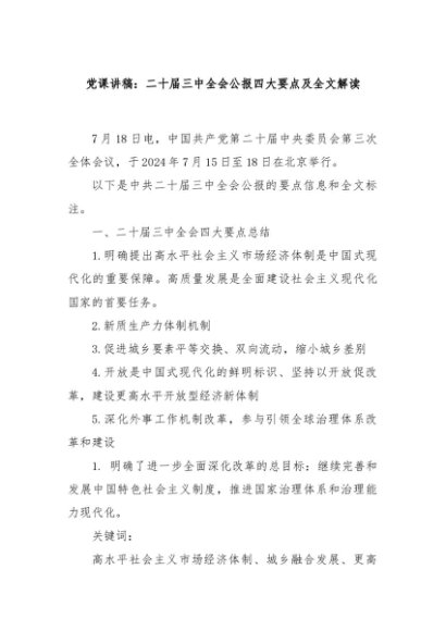 / 【七哥公文】2024年:党课讲稿:二十届三中全会公报四大要点及全文解读+更多免费公文+VX:QiGeGongWen2024