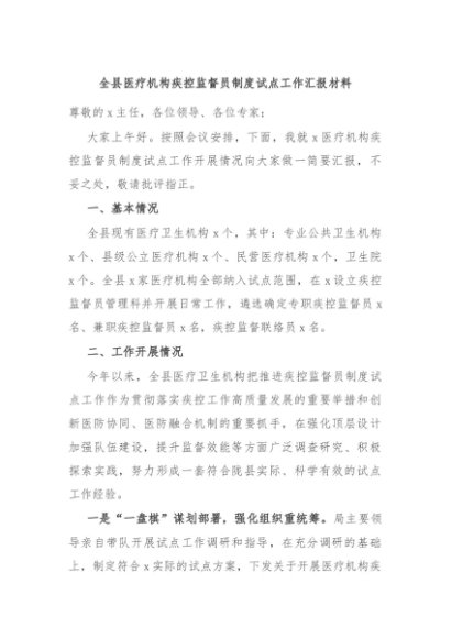 / 【七哥公文】2024年:全县医疗机构疾控监督员制度试点工作汇报材料+更多免费公文+VX:QiGeGongWen2024