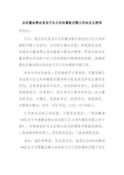 【七哥公文】2024年:全区整治群众身边不正之风和腐败问题工作会议主持词+更多免费公文+VX:QiGeGongWen2024
