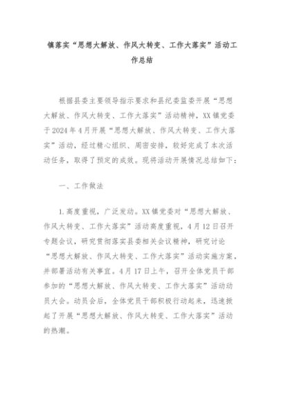 【七哥公文】2024年:镇落实“思想大解放、作风大转变、工作大落实”活动工作总结+更多免费公文+VX:QiGeGongWen2024