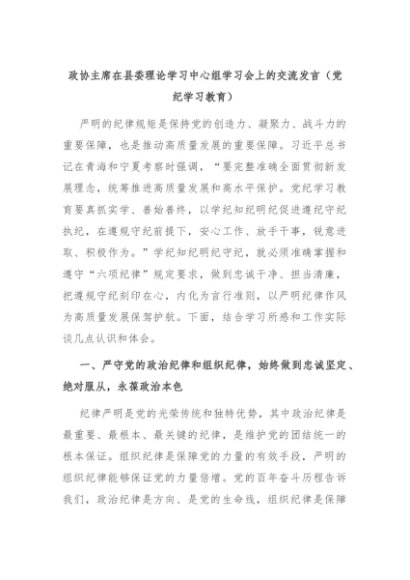 【七哥公文】2024年:政协主席在县委理论学习中心组学习会上的交流发言(党纪学习教育)+更多免费公文+VX:QiGeGongWen2024