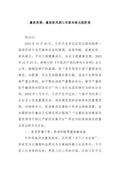 / 【七哥公文】2024年:廉政党课:廉洁家风润心田固本培元筑防线+更多免费公文+VX:QiGeGongWen2024