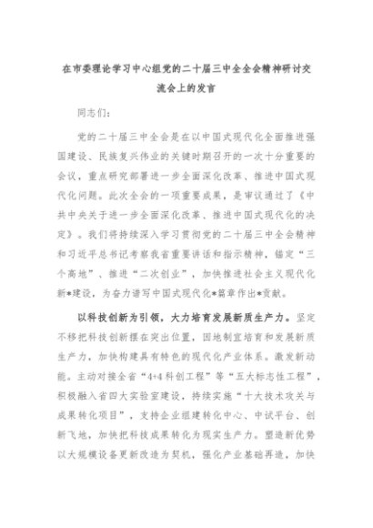 【七哥公文】2024年:在市委理论学习中心组党的二十届三中全全会精神研讨交流会上的发言+更多免费公文+VX:QiGeGongWen2024